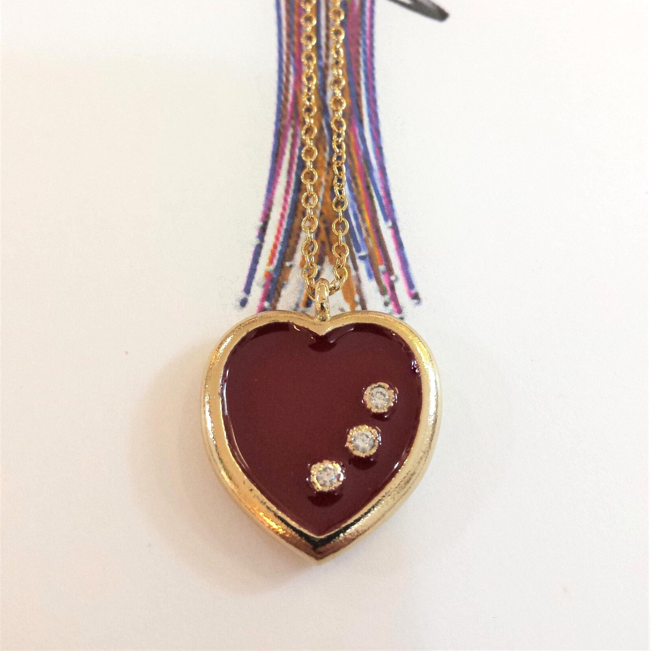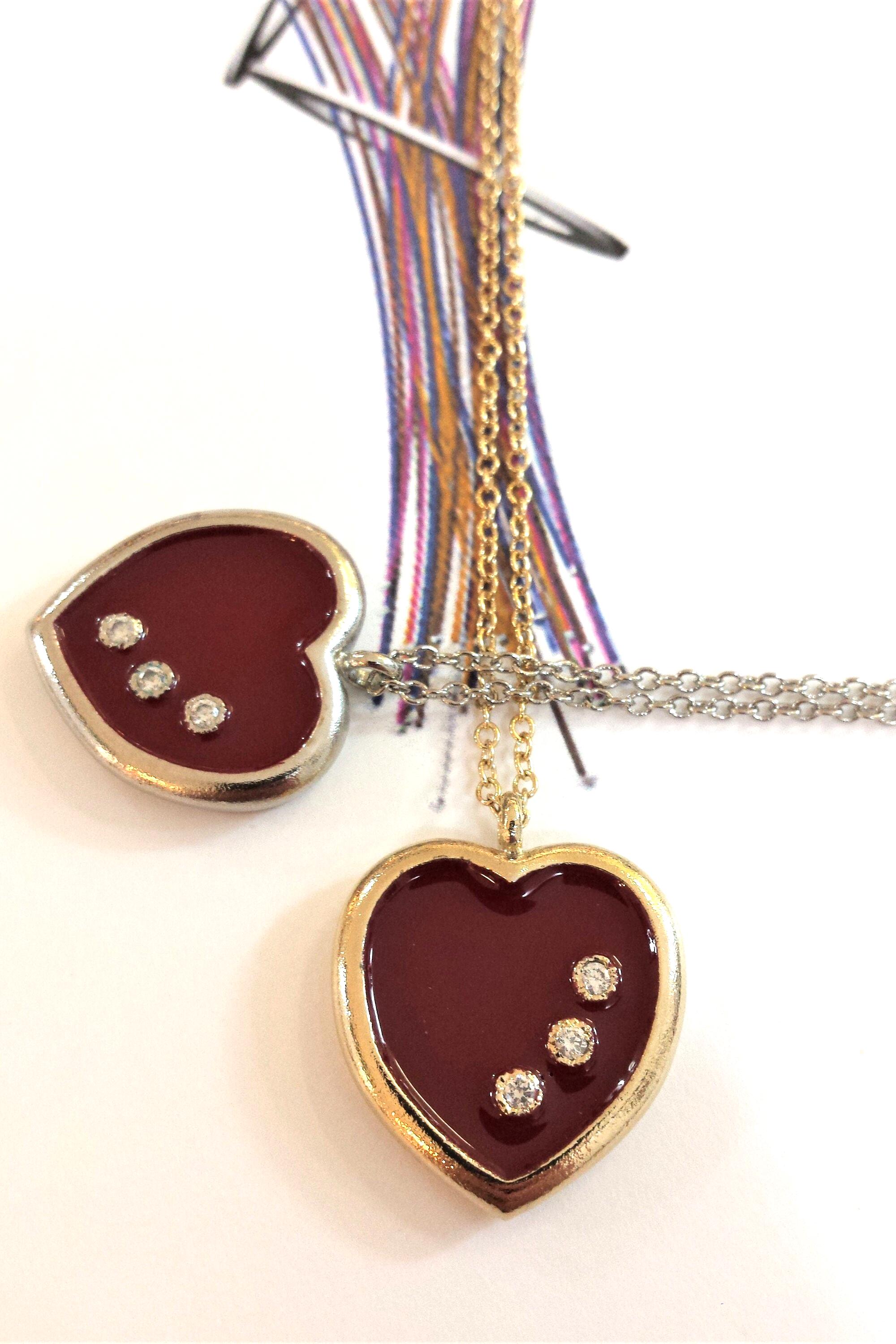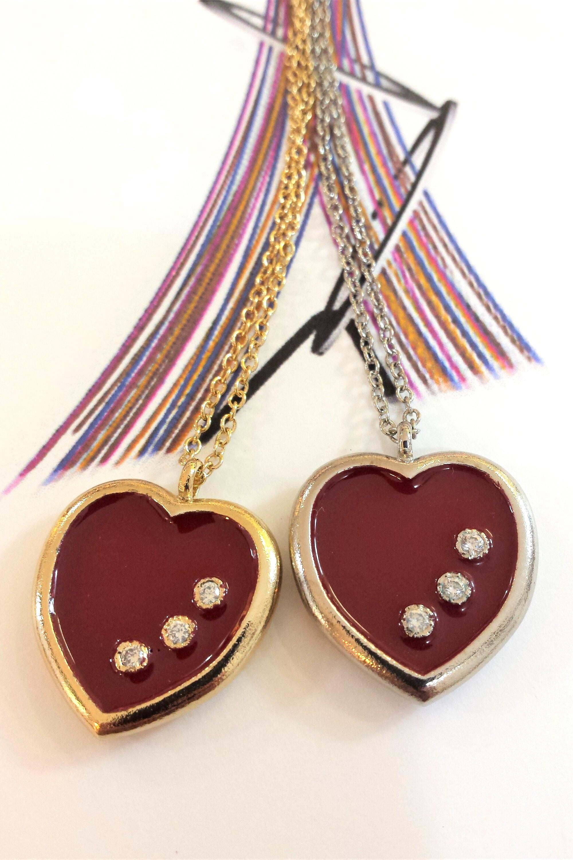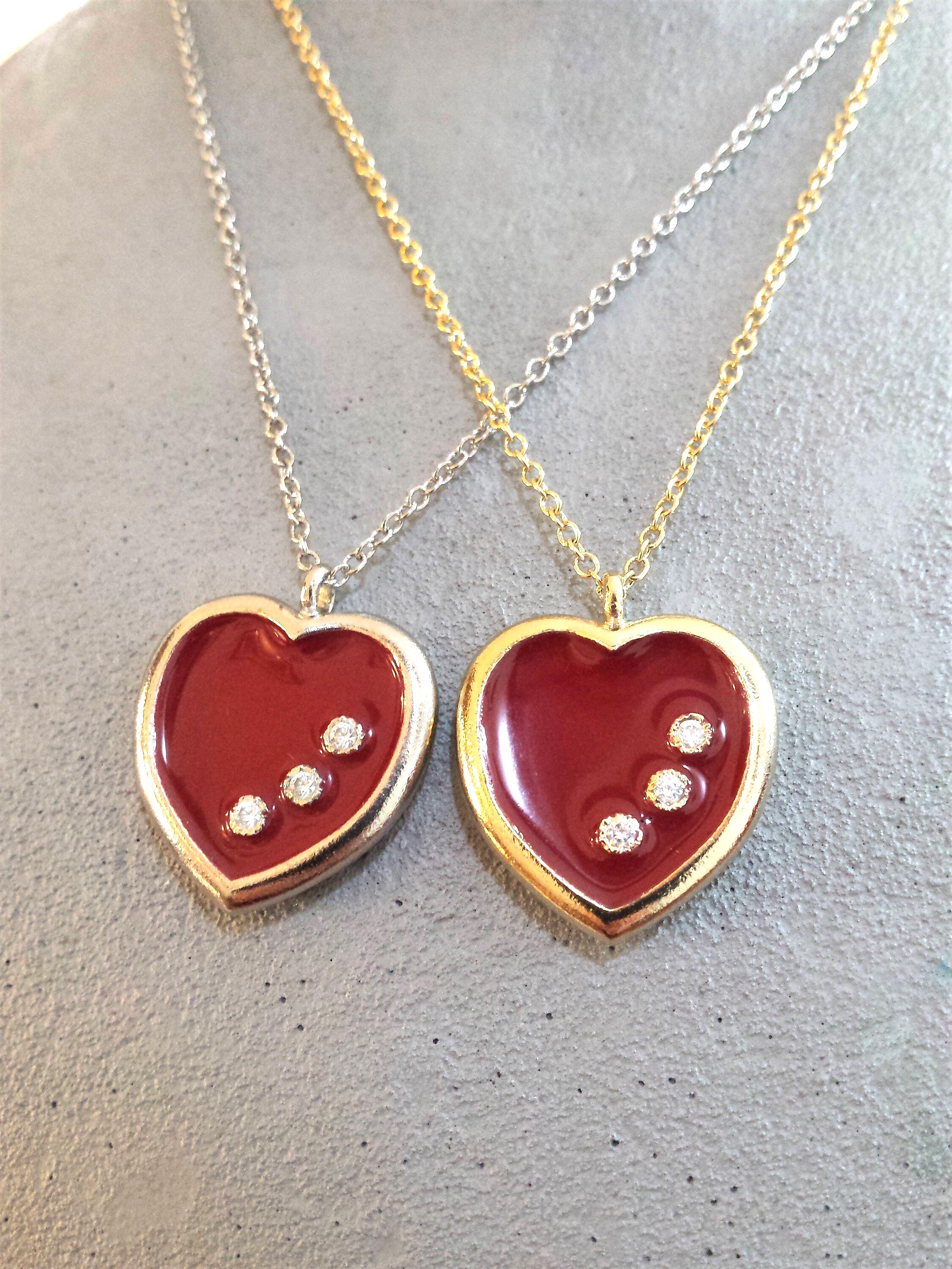 VALENTINE 3 is a handmade gold/palladium-plated bronze pendant with scratch enamel finish and cubic zirconia, featuring a delicate chain. This necklace is the perfect gift to celebrate Valentine's day.