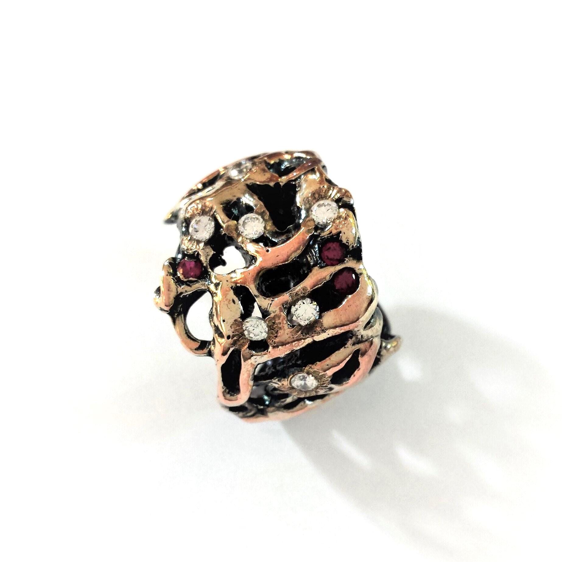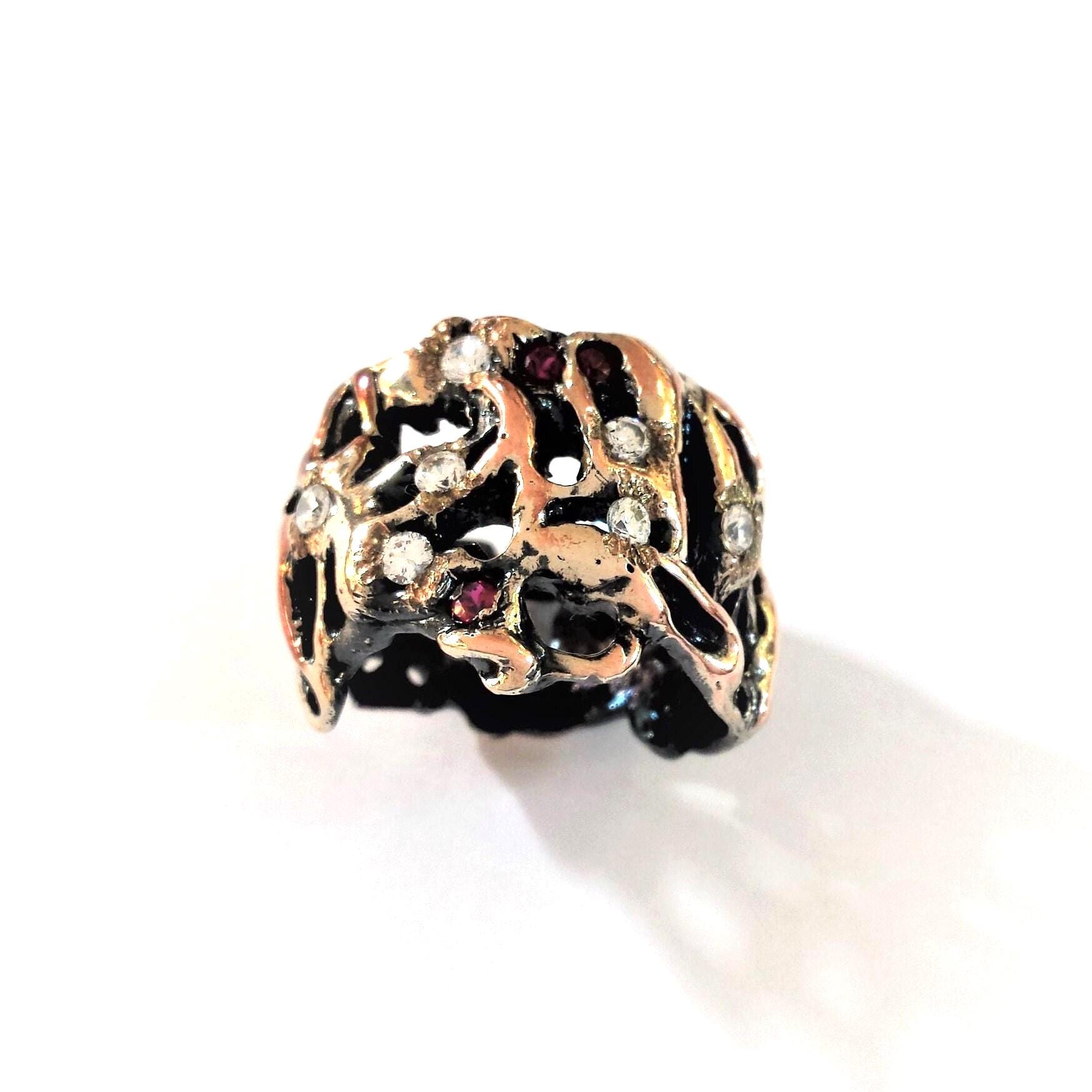 Bronze is the absolute master of the LAURA ring. Partly burnished, it gives the warm color of the metal that is the seat of zircons and rubies like small bright stars. Great attention to the construction in hot-cast wax. This jewel is made unique and attractive by its particular handwork.