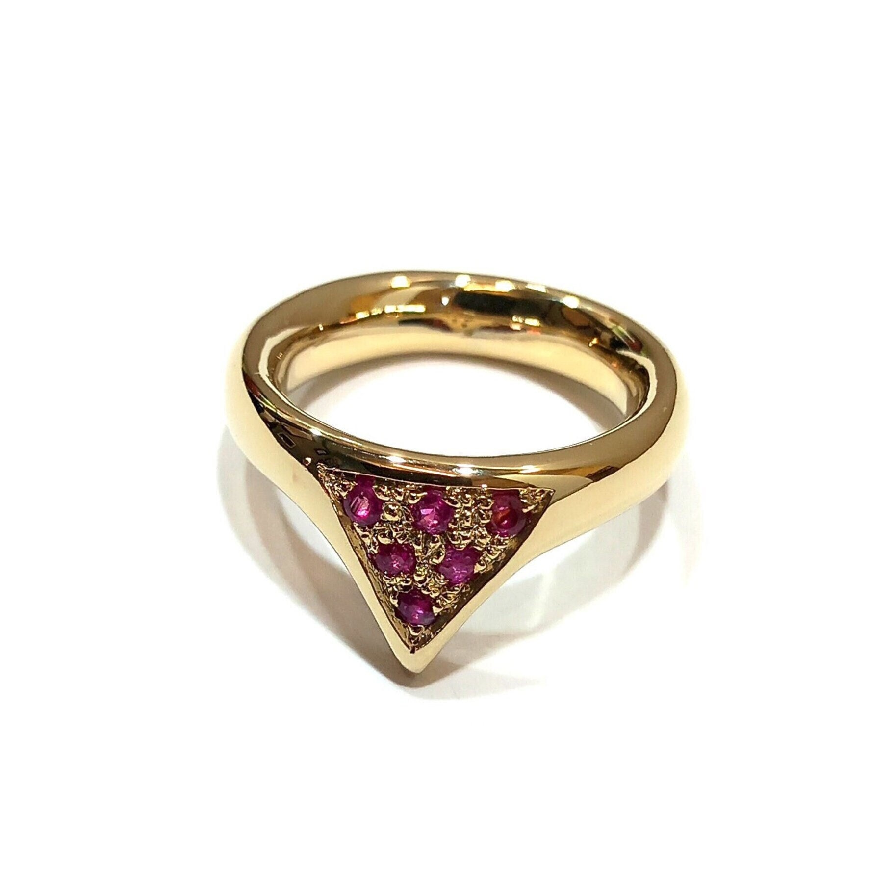 🌟Add a touch of mystery and charm to your look with our exclusive 24Kt gold-plated bronze ring, made entirely by hand by skilled Florentine artisans. This ring represents a modern reinterpretation of the classic "Indian" wedding band, enriched with a triangle-shaped central element and hand-set natural rubies for a touch of timeless elegance.