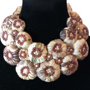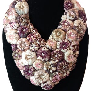 ✨ Handcrafted necklace in silk jersey, Bohemian crystals and glass beads A unique piece, entirely handmade with passion and craftsmanship in the heart of Florence. This spectacular necklace is composed of a rich composition of silk jersey elements, each embellished with embroidered details, Bohemian crystals and glass beads that add light and refinement. The vibrant shades of purple, yellow, orange and pink blend harmoniously, creating a sophisticated and original accessory, perfect for those who love to stand out with extravagance.