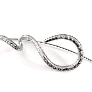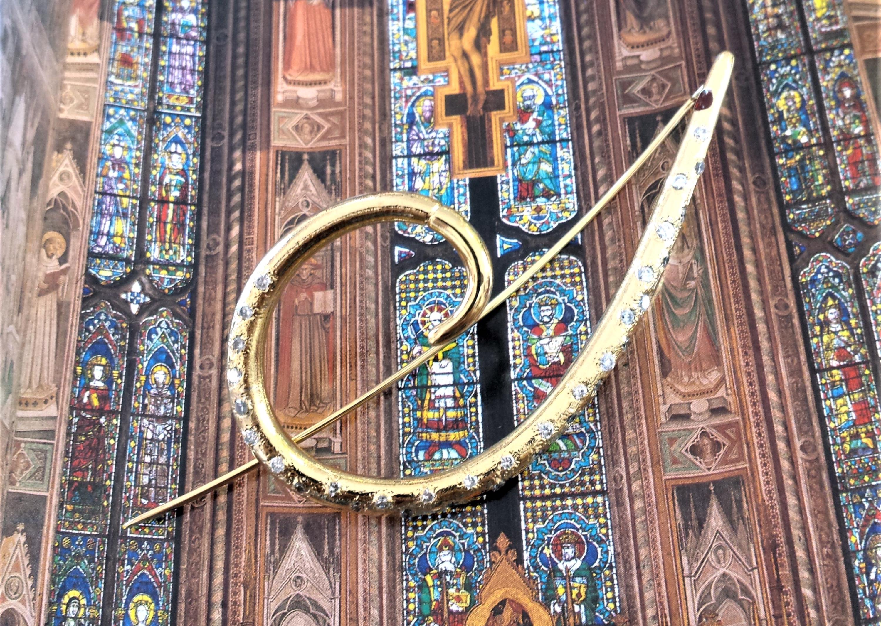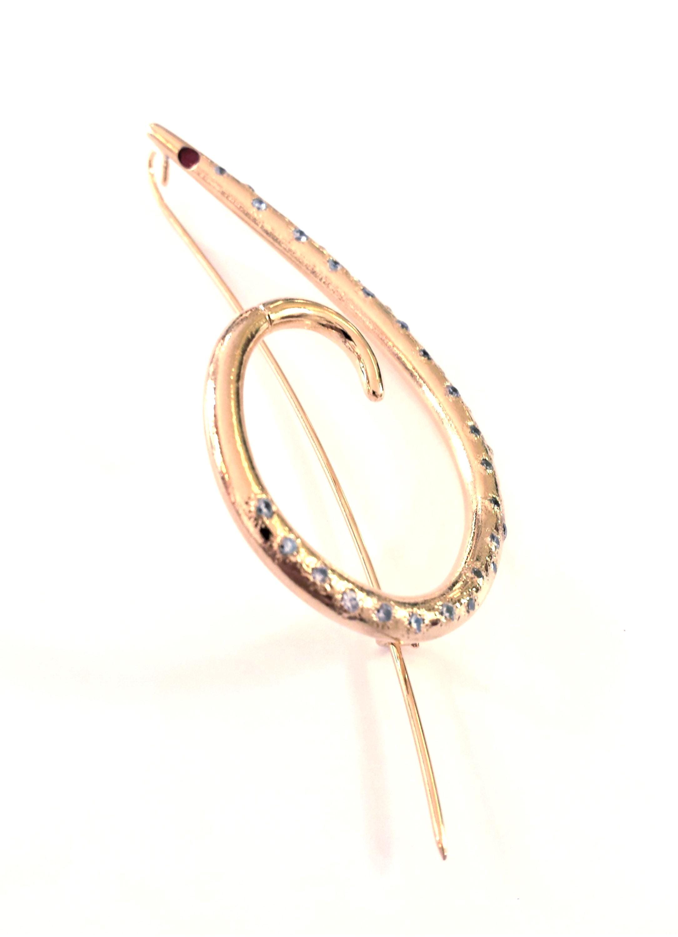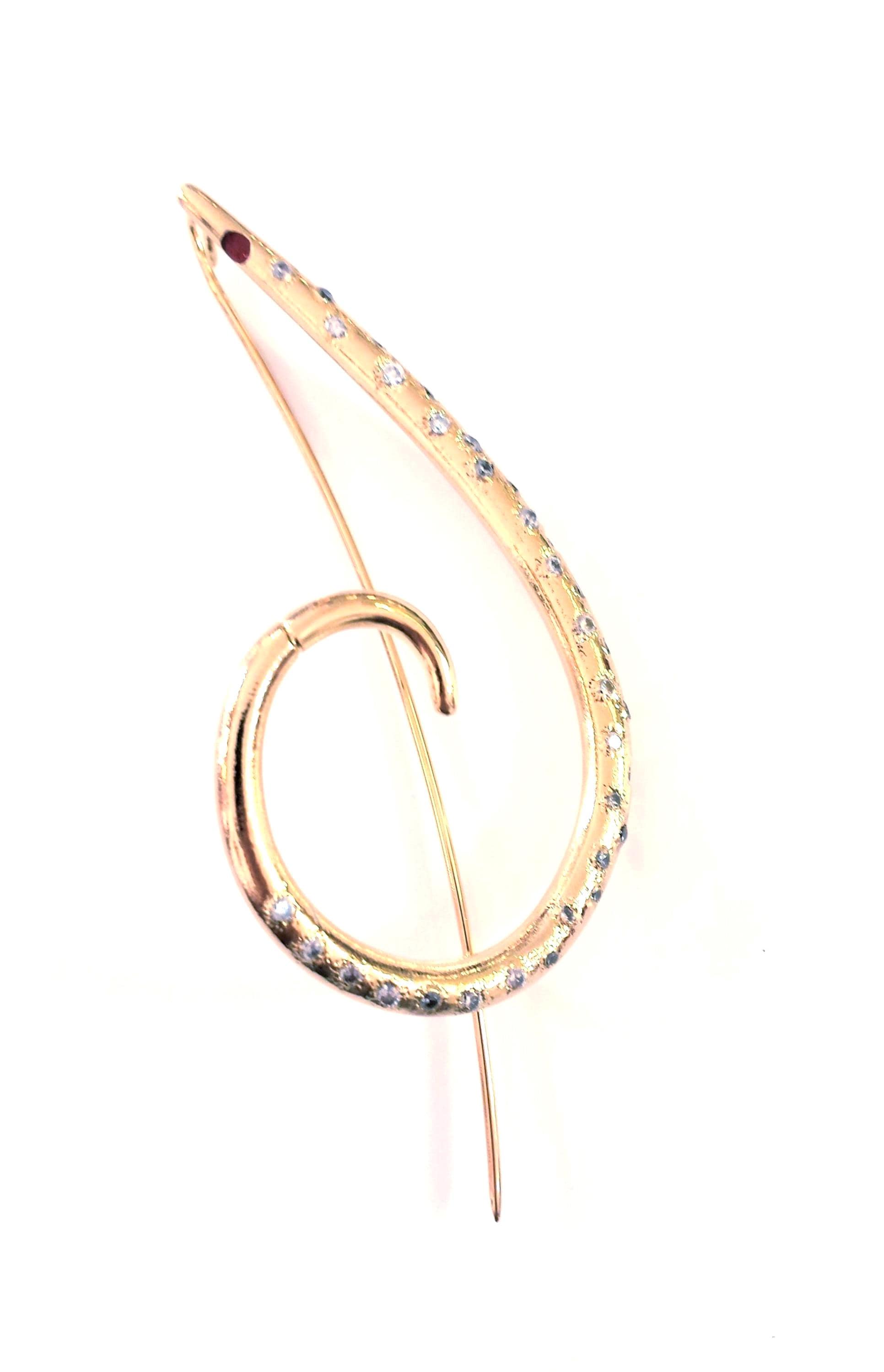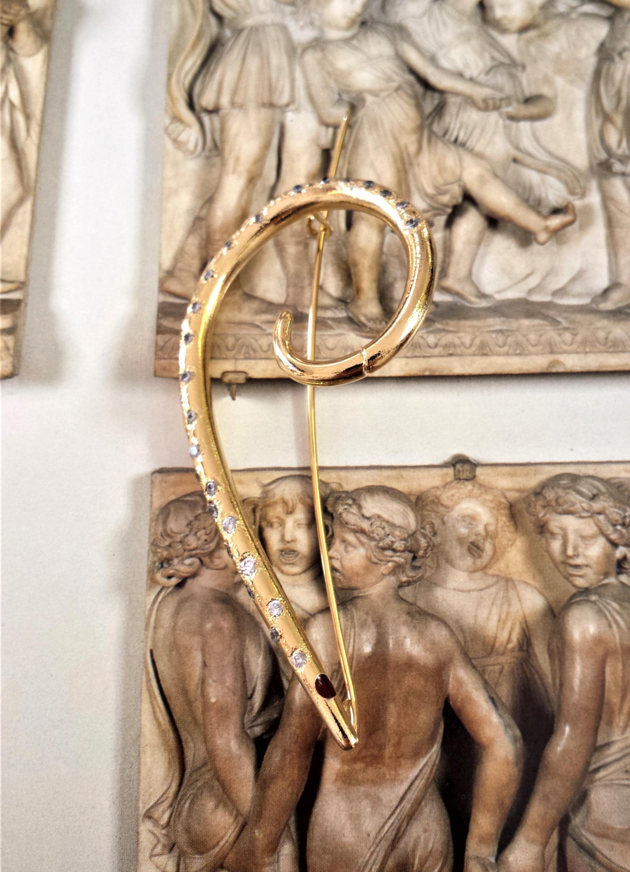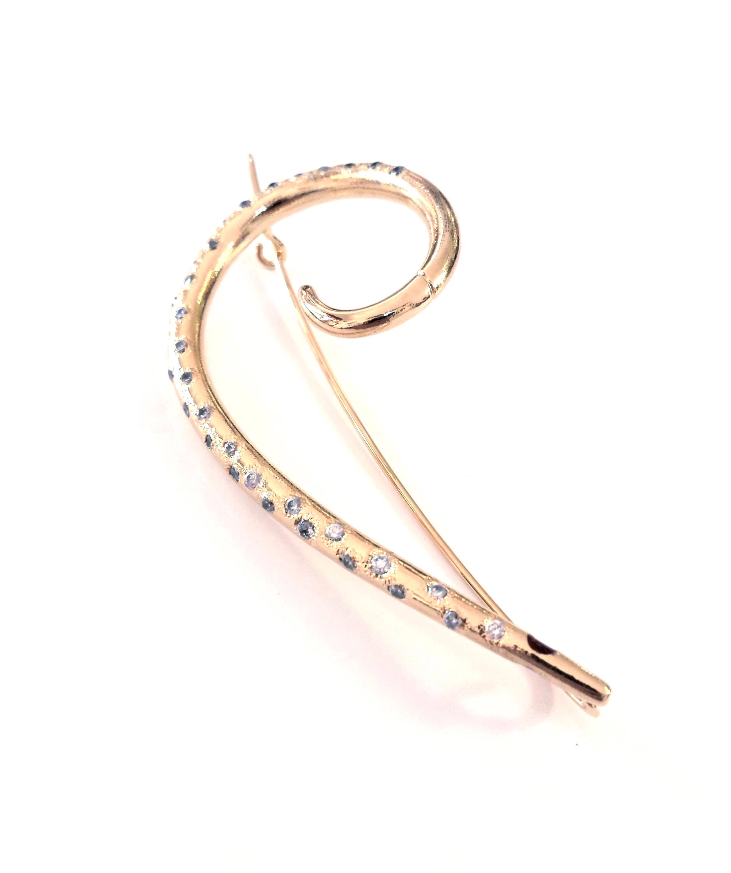 Elegance meets craftsmanship in this exquisite brooch, handcrafted in gold-plated bronze and adorned with hand-set cubic zirconia. Its graceful, swirling design evokes a musical note or decorative flourish, making it a striking accessory to elevate any outfit.