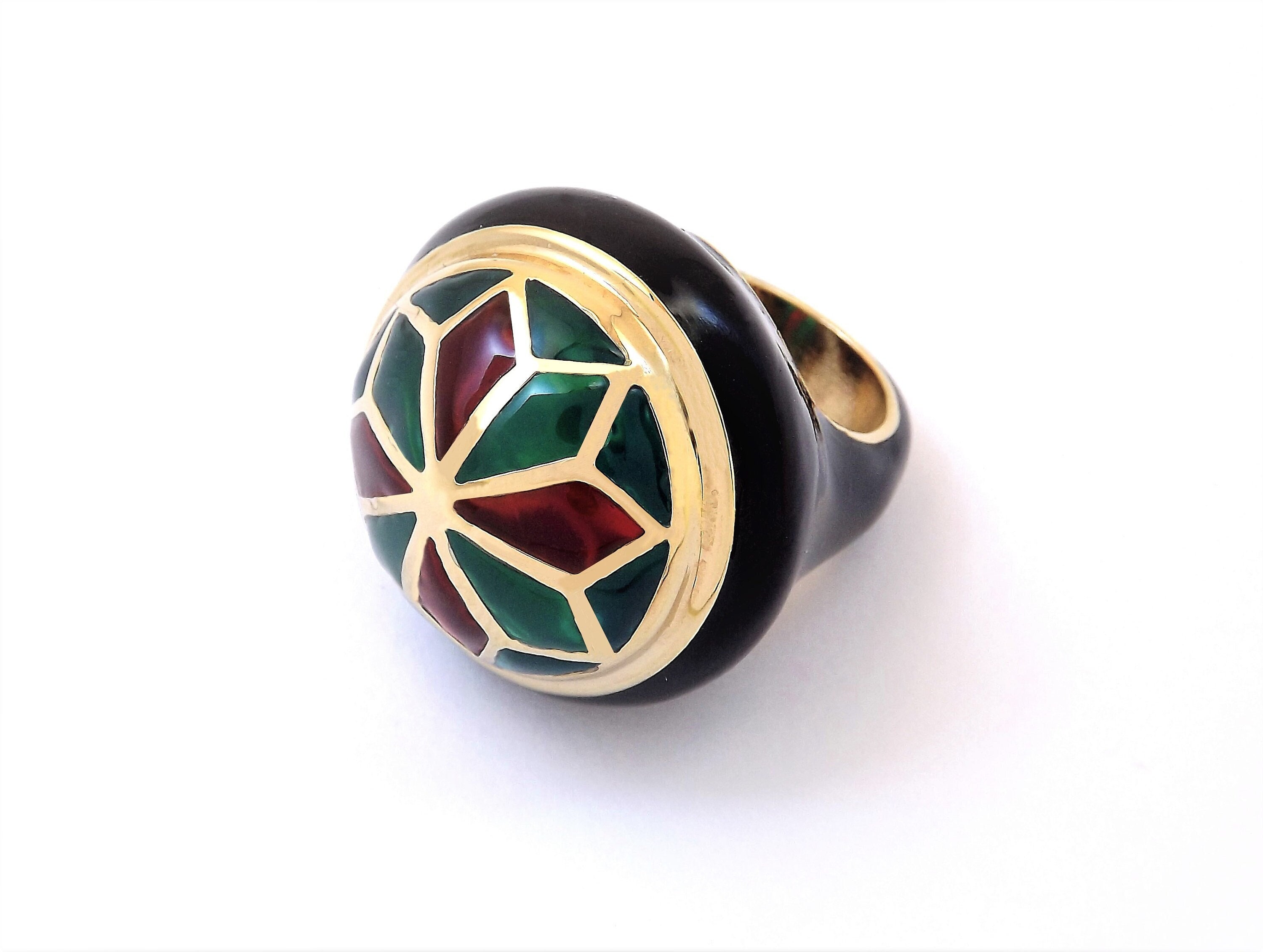 EMMA is a handmade gold-plated bronze ring featuring scratch-proof enamels that reference the stained glass windows adorning the grandest basilicas and palazzos of Florence. A deco-influenced piece of jewelry, this ring is playfully nostalgic but also extremely of-the-moment.