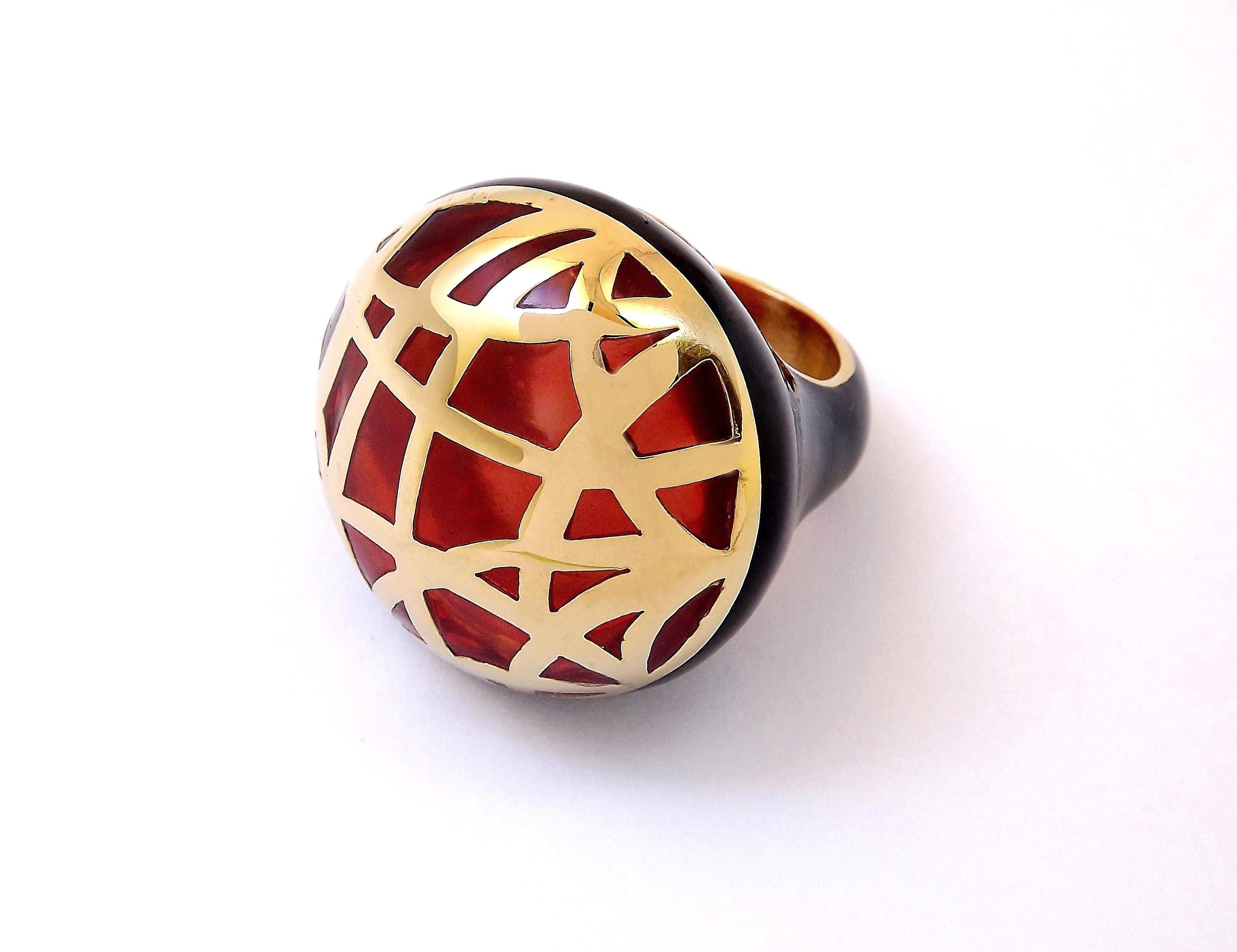 IRIS is a handmade gold-plated bronze ring featuring scratch-proof enamels that reference the stained glass windows adorning the grandest basilicas and palazzos of Florence. A one-of-a-kind piece of jewelry that has a subtle Art Deco feel, this ring is meant to be worn every day.