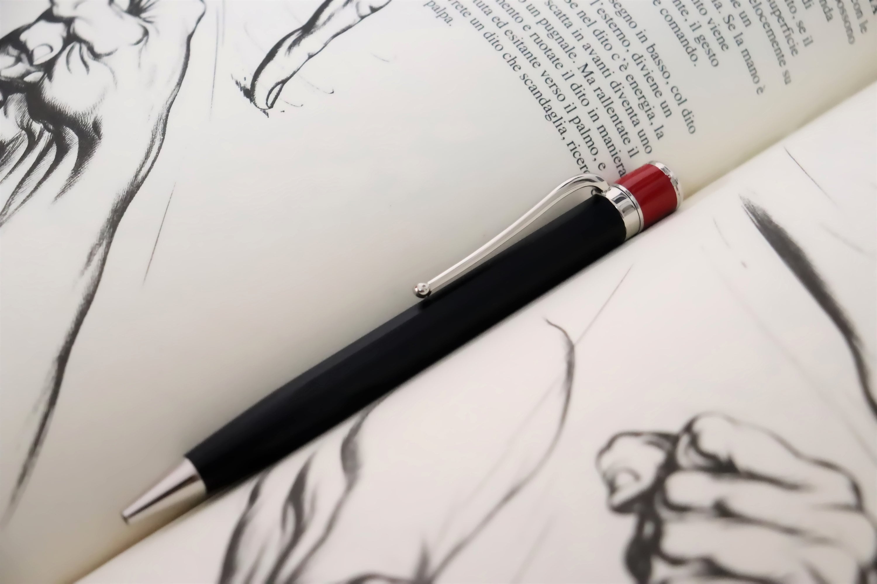SOMMO POETA is a handmade precious resin ballpoint pen with nickel-free 24kt palladium plated bronze elements and scratch-proof enamels. Its colors are not accidental: red distinguishes both the Florentine lily and Dante Alighieri’s headdress; black epitomizes elegance. The color of palladium in the metal parts was chosen to give an image of linear and contemporary design. The soft and sinuous line of the clip unequivocally recalls Dante's profile.
